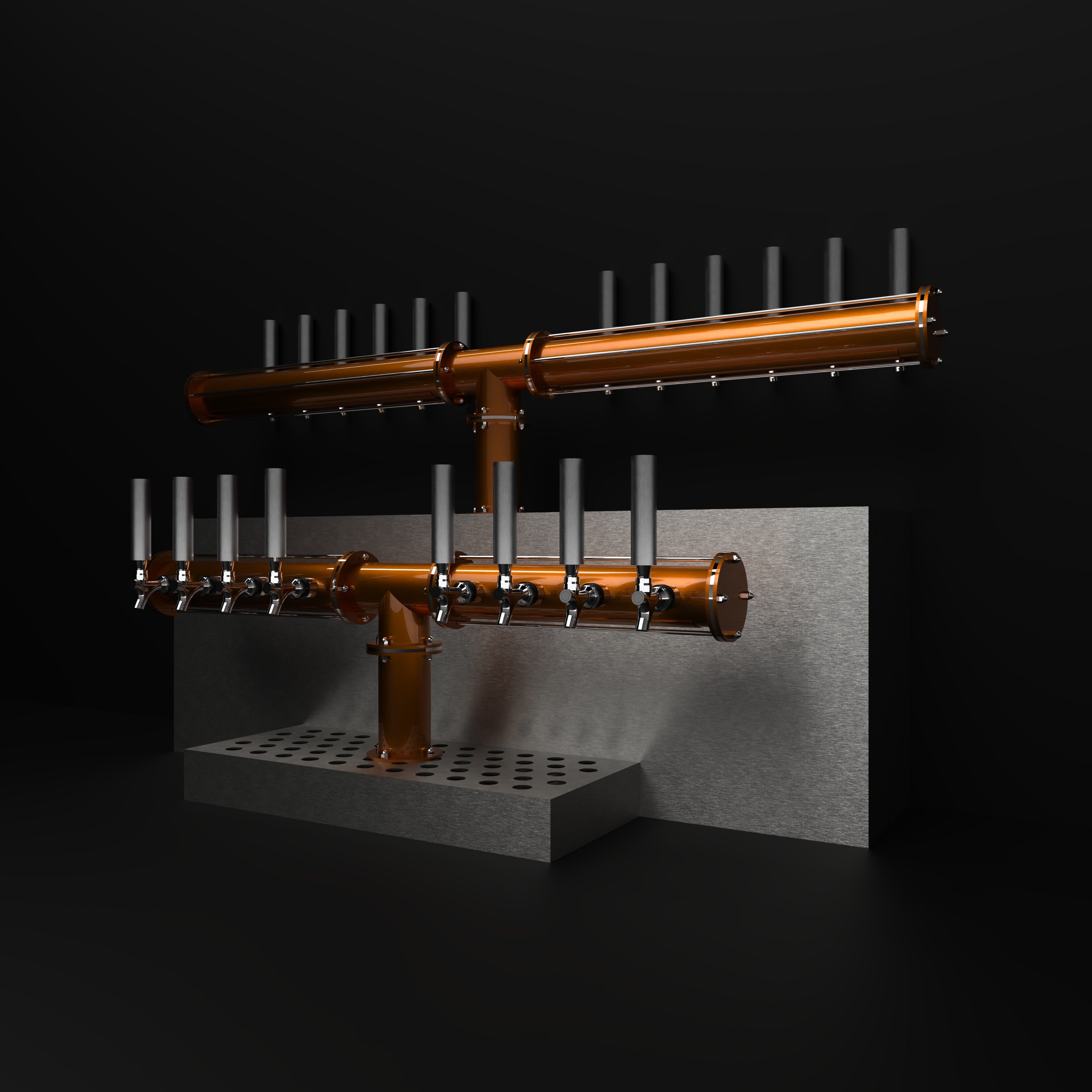 The Axios Double Tee doubles down on the collection's distillery-inspired aesthetic, featuring two T-shaped towers adorned with the characteristic 1/4in tubing. This design is for establishments wanting to make a significant impact with a piece that's both functional and a nod to brewery artistry.